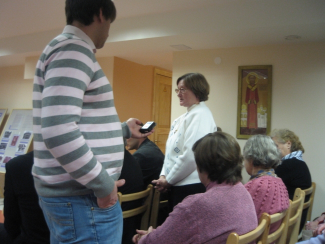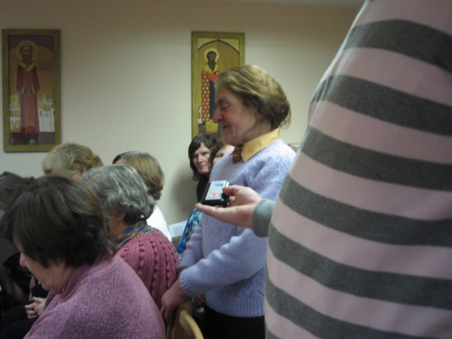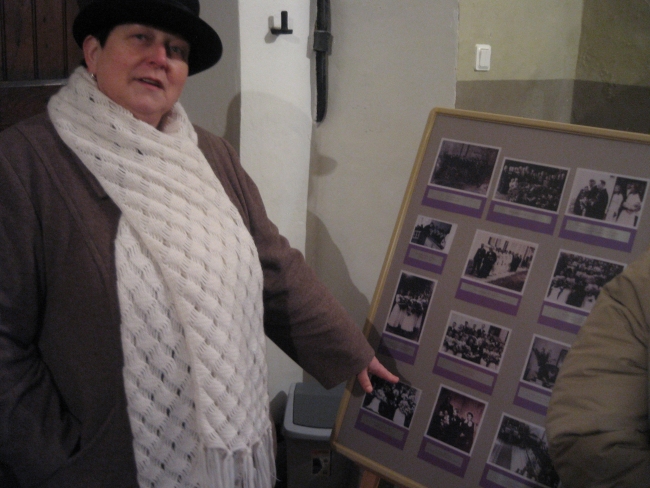 Draudzes priekšniece Lauma rāda uz bildi, kurā mācītājs Akmentiņš viņai kristībās pasniedz lelli.